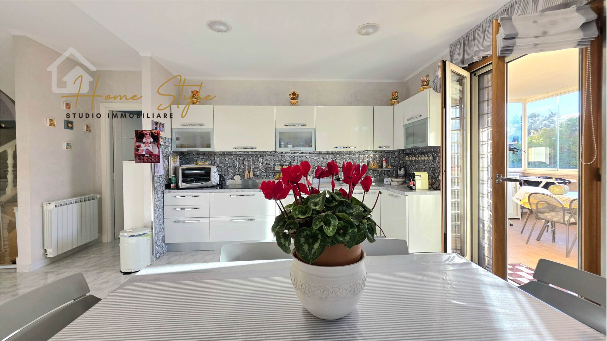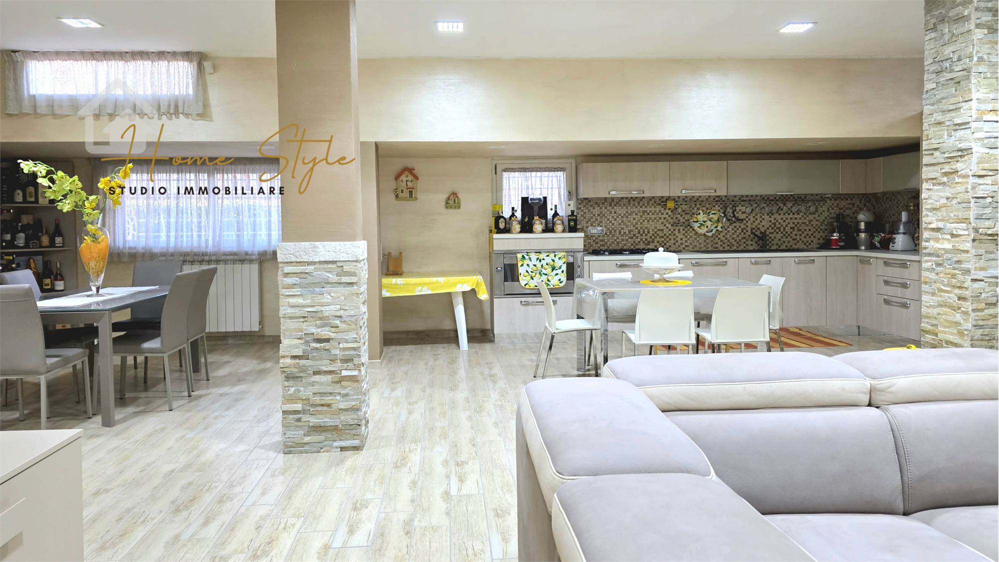 matrimoniale, una cameretta e un bagno. Tutti gli ambienti hanno finestre regolari che affacciano sul giardino di proprietà. Al piano giorno troviamo un ampio soggiorno con angolo salotto, uno studio e un bagno oltre ad una bellissima e comoda cucina che affaccia su un portico con splendida